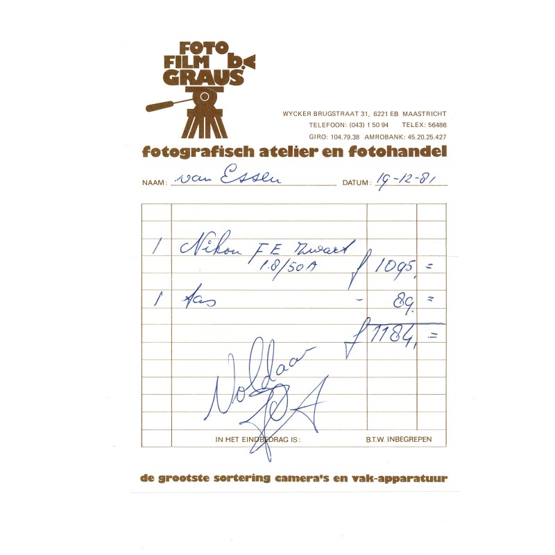 Aangeschaft op 19 december 1981 bij Foto Film Graus te Maastricht. Voor de camera + 50mm f/1.8 lens heb ik 1.095 gulden betaald.
